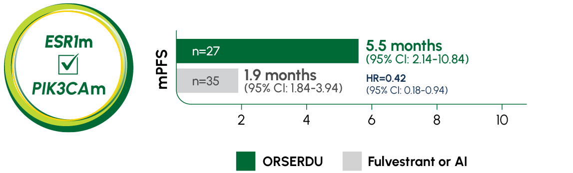 A statistically significant PFS was observed in the ITT population and in the subgroup of patients with ESR1-mutated mBC. The exploratory PFS analysis in the 250 patients (52%) without ESR1 mutations showed an HR of 0.86 (95% CI: 0.63-1.19), suggesting that the improvement observed in the ITT population was primarily driven by outcomes in patients with ESR1-mutated mBC1