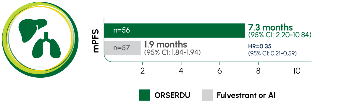 *AI therapy included anastrozole, letrozole, or exemestane.1 †Prespecified, descriptive analyses: PFS rates at 3, 6, 12, and 18 months were estimated using Kaplan–Meier methodology and were not powered to detect statistical difference at these time points. 3 months: ORSERDU 55.9% (95% CI: 45.8-66.1) vs fulvestrant or AI 39.6% (95% CI: 29.4-49.7); 6 months: ORSERDU 40.8% (95% CI: 30.1-51.4) vs fulvestrant or AI 19.1% (95% CI: 10.5-27.8); 12 months: ORSERDU 26.8% (95% CI: 16.2-37.4) vs fulvestrant or AI 8.2% (95% CI: 1.3-15.1); 18 months: ORSERDU 24.3% (95% CI: 13.7-35.0) vs fulvestrant or AI (NE).3